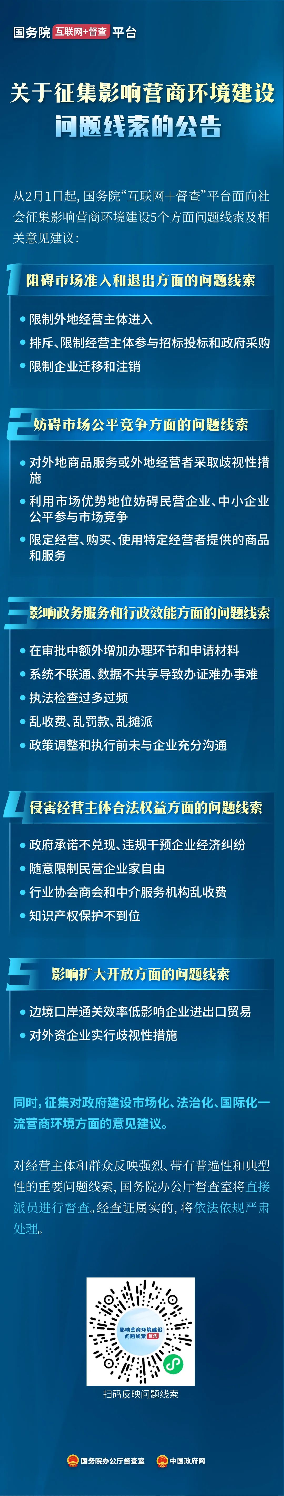 为贯彻落实党中央、国务院关于推动高质量发展,建设市场化、法治化、国际化一流营商环境的重大决策部署,进一步推动全国统一大市场建设,促进民营经济健康发展,督促解决影响营商环境建设的突出问题,国务院“互联网+督查”平台从即日起面向社会征集5个方面的问题线索及意见建议。