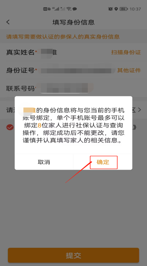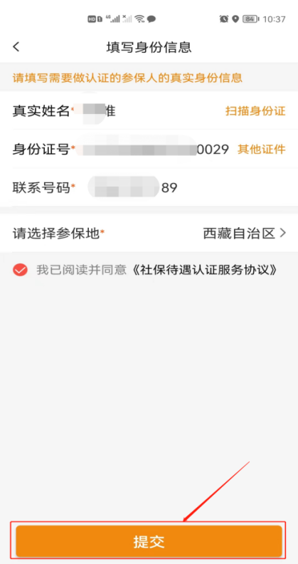 5.录入参保人姓名、身份证号(可点击右侧“扫描身份证”读取人员信息)、联系电话,然后点击下方“提交”按钮,如图: