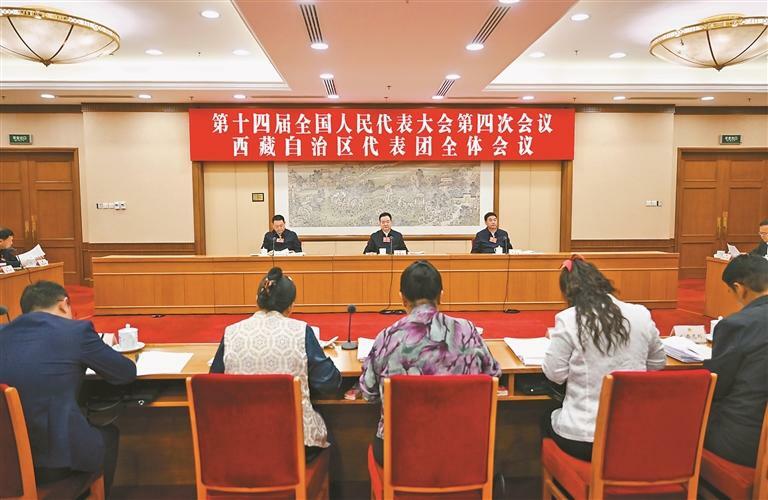 西藏代表团举行全体会议审议有关报告和决议草案王君正严金海参加嘎玛泽登主持
